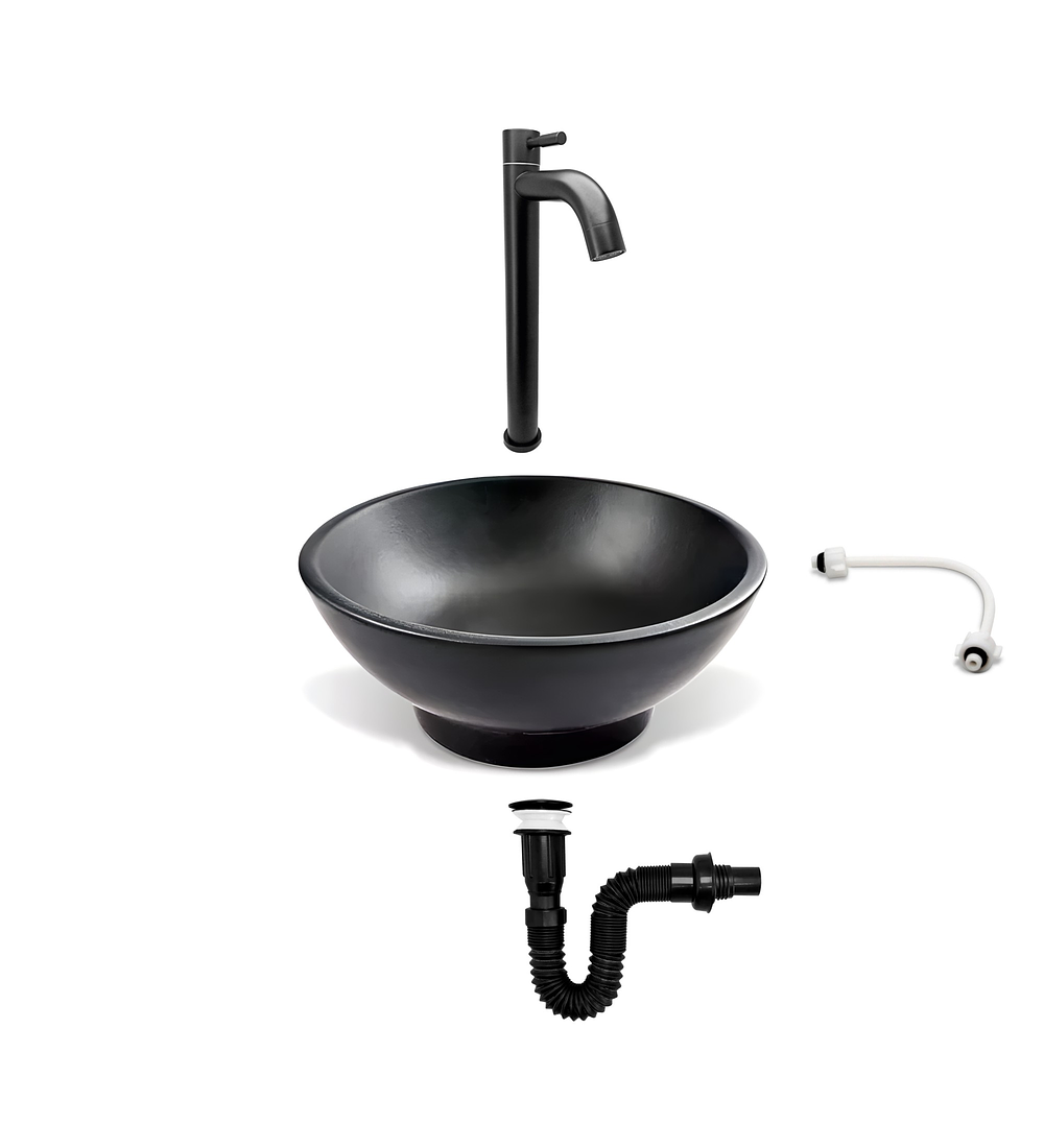 - Combo de lavamanos redondo para baño, fabricado en cerámica de color negro material de alta calidad. Incluye una grifería negro mate para agua fría , y viene acompañado de accesorios de instalación como acople, sifón y sistema push. Este combo combina elegancia y funcionalidad, ofreciendo un toque sofisticado y moderno a tu baño