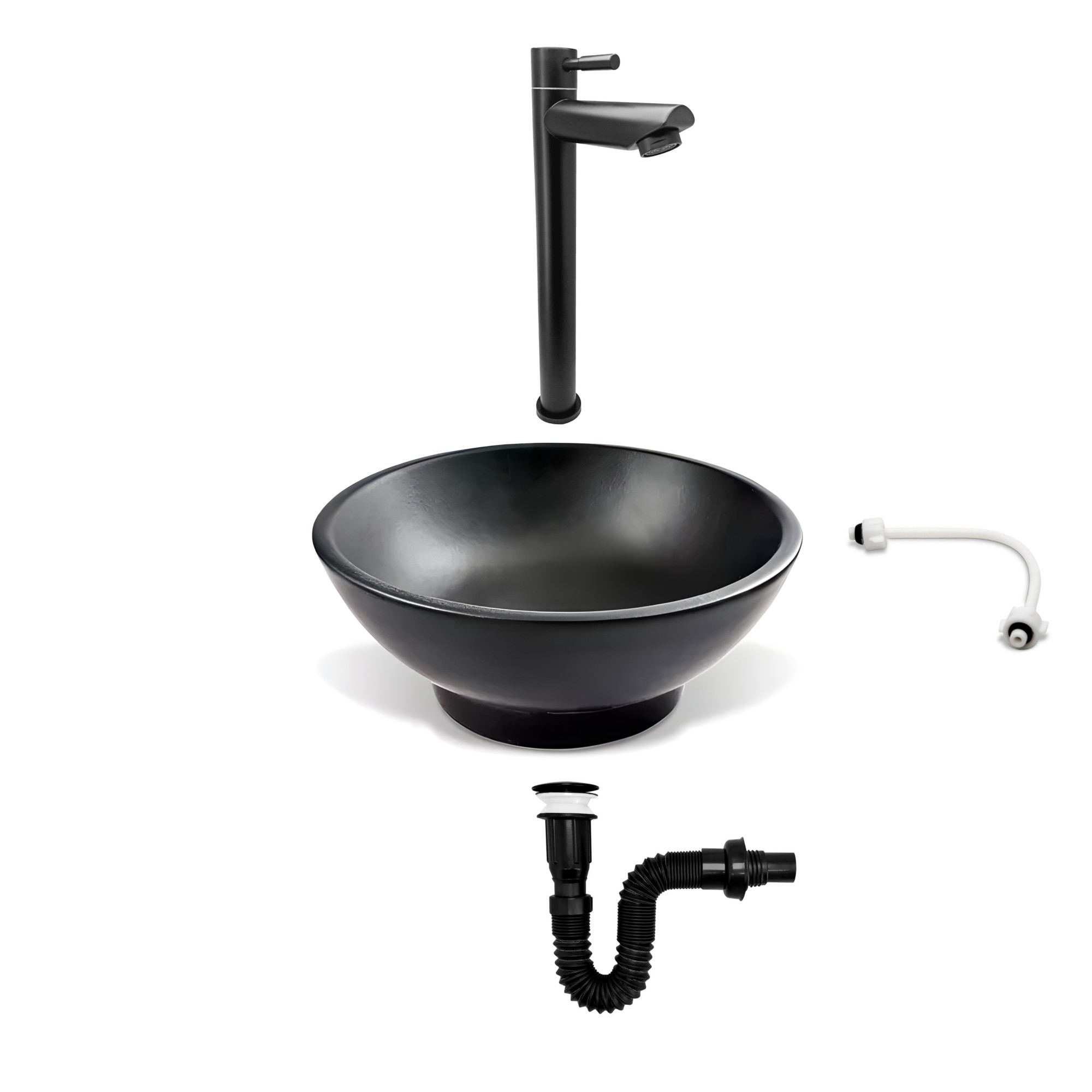- Combo de lavamanos redondo para baño, fabricado en cerámica de color negro material de alta calidad. Incluye una grifería negro mate para agua fría , y viene acompañado de accesorios de instalación como acople, sifón y sistema push. Este combo combina elegancia y funcionalidad, ofreciendo un toque sofisticado y moderno a tu baño