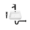 - Este combo proporciona una solución integral y versátil para tu baño. El lavamanos cuadrado blanco combina calidad y elegancia, mientras que la grifería negra con un acabado mate asegura un rendimiento óptimo y libre de goteos. Además, el combo incluye accesorios como un push con sifón en color negro y acoples para el paso de agua fría y caliente, complementando perfectamente tu grifería.