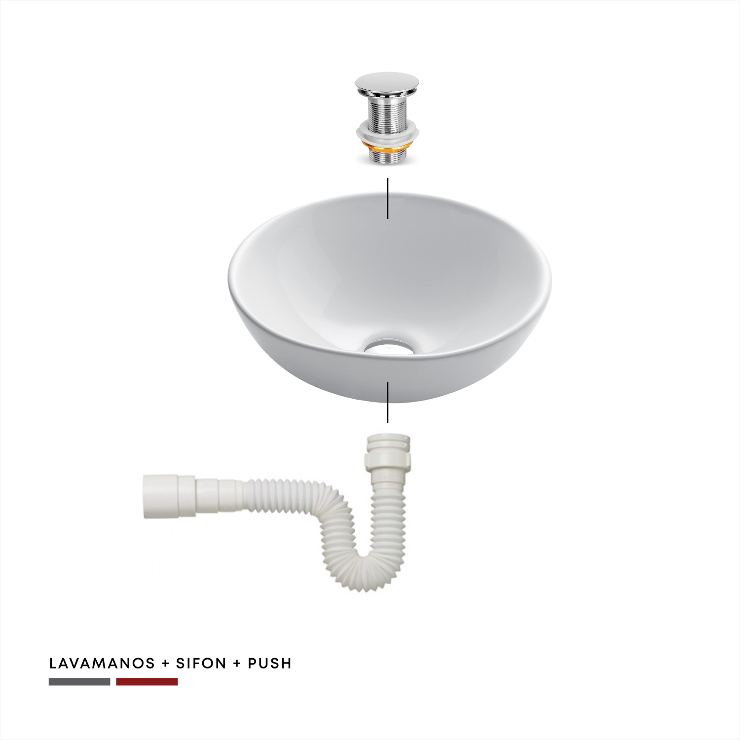 Combo Lavamanos Sobreponer Redondo Blanco 32*14 Catleya + Push + Sifon Pvc