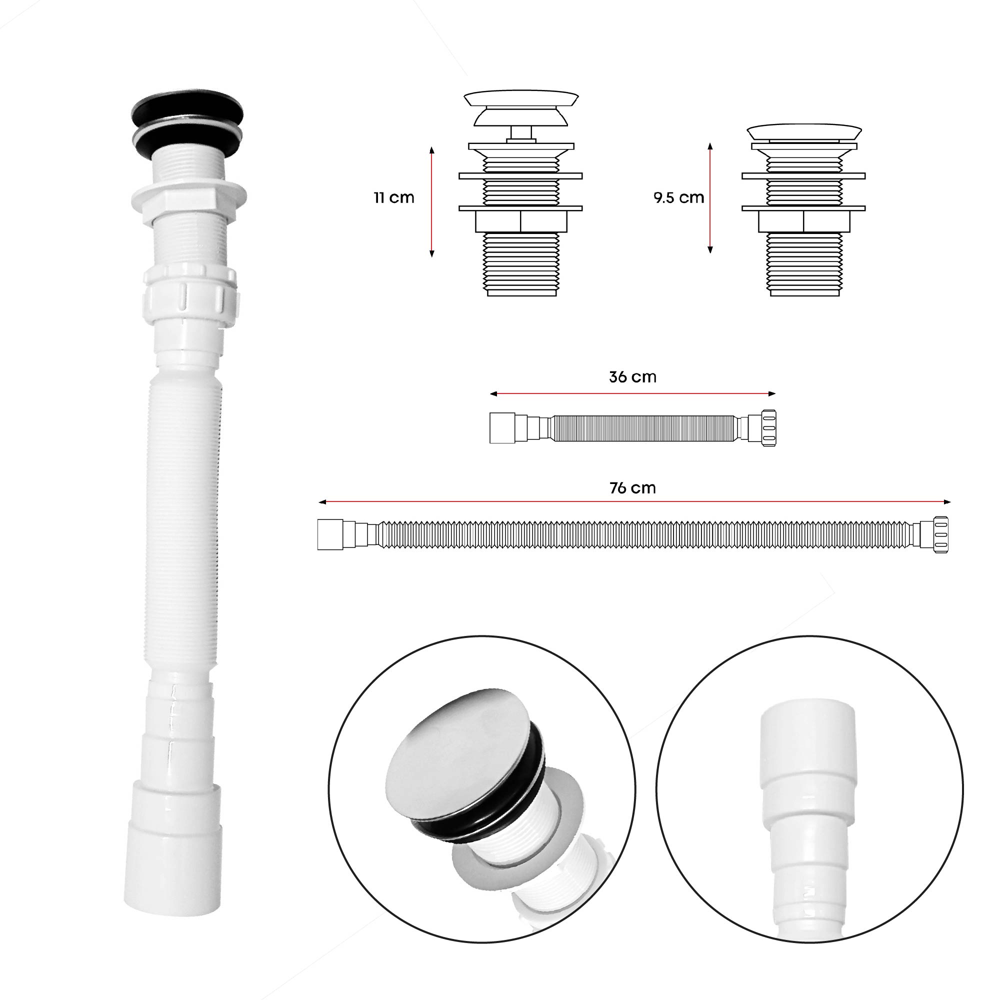 - Push Acero Con Sifón Flexible Blanco En PVC