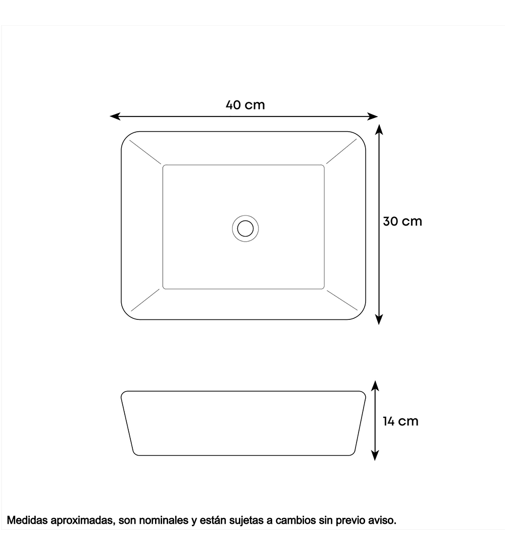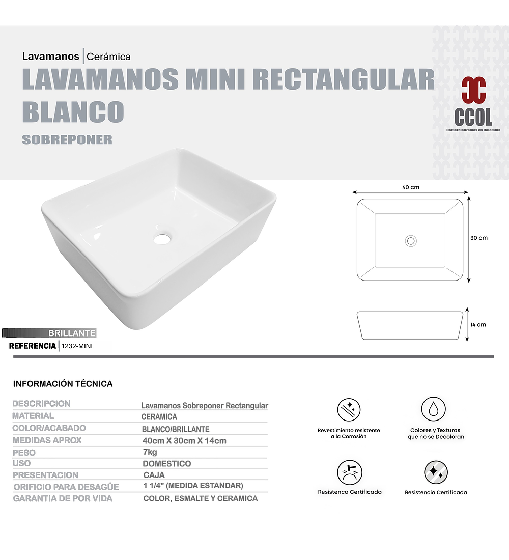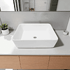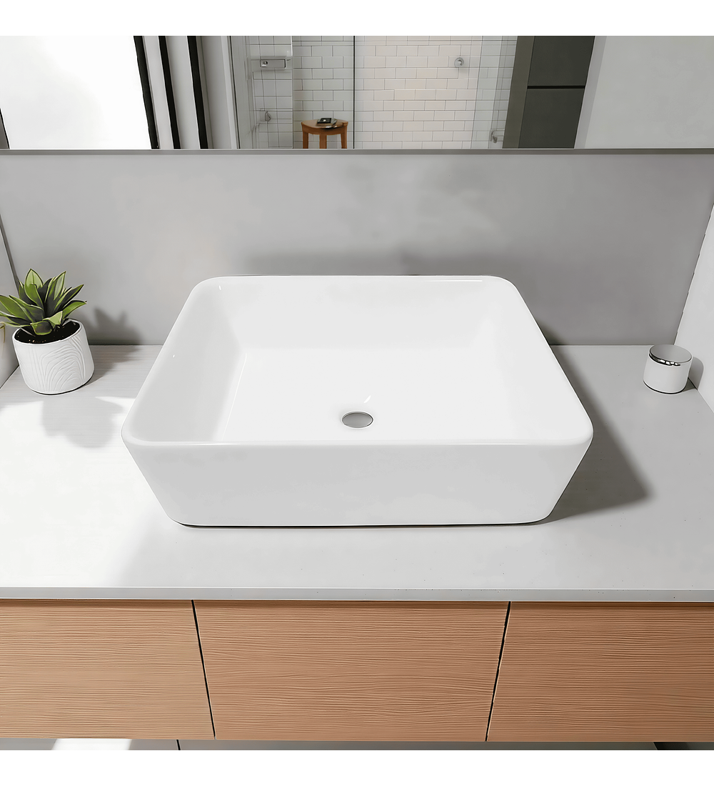 - Lavamanos rectangular de cerámica blanca para sobreponer, elegante que aporta estilo a cualquier baño. Su acabado brillante realza la limpieza y amplitud del espacio, mientras que su formato moderno ofrece gran comodidad de uso y fácil instalación sobre mueble o cubierta. Ideal para quienes buscan funcionalidad y resistencia.