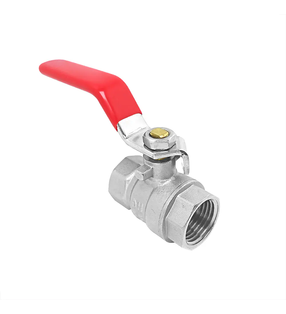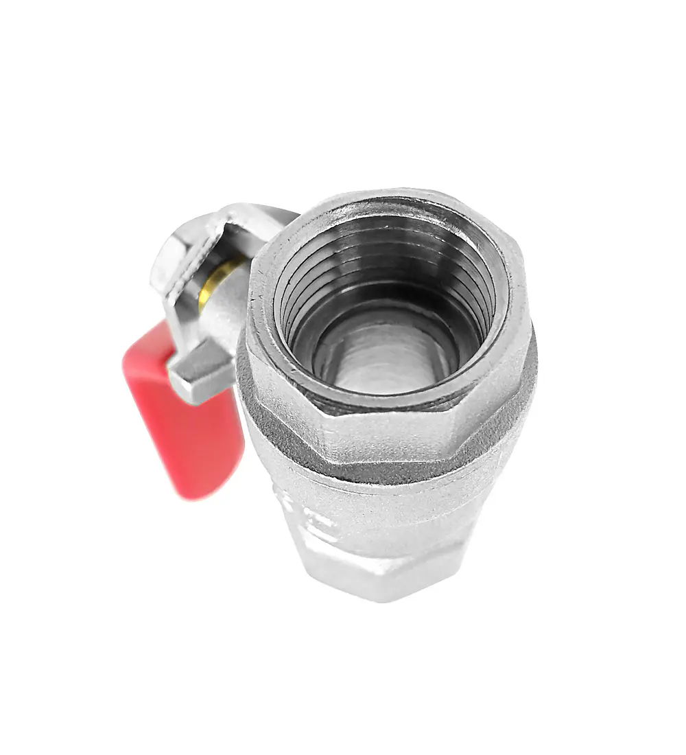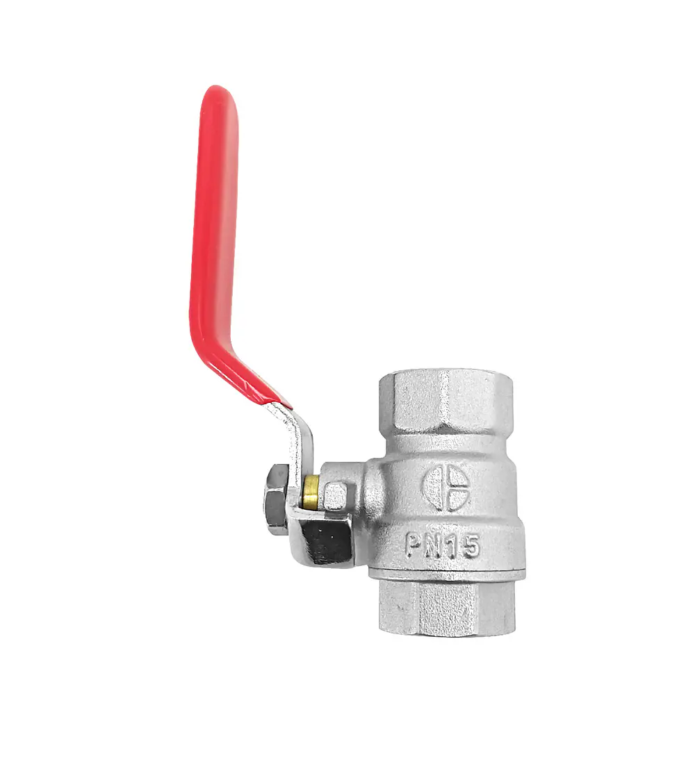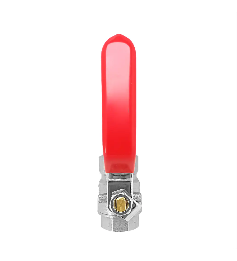 Un práctico y resistente grifo HI-HI PN15 con una manija de acero rojo, asiento de teflón y cuerpo de latón niquelado. Su válvula de bola de rápida instalación asegura durabilidad y resistencia a la corrosión, ideal para diversos usos. - Características: