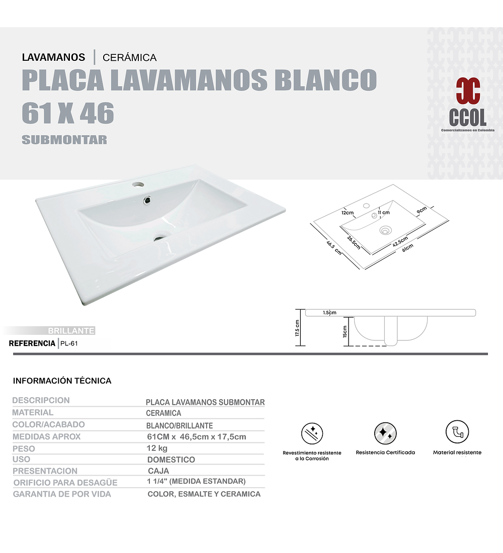 - Placa Lavamanos Blanco Submontar 61x46.5x19cm