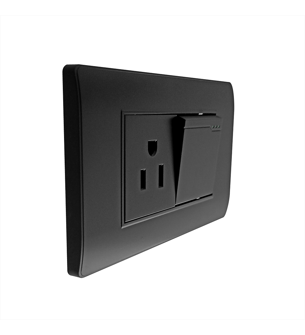 Toma + Interruptor para pared en color negro, cuenta con un diseño elegante y novedoso. Un producto de fácil instalación y de alta durabilidad.
